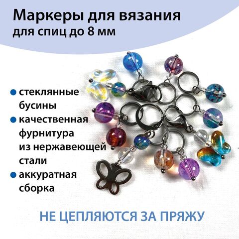 • 8 маркеров с разноцветными бусинами на литых кольцах (внутренний диаметр 10 мм, подходят для спиц до 8 мм)
